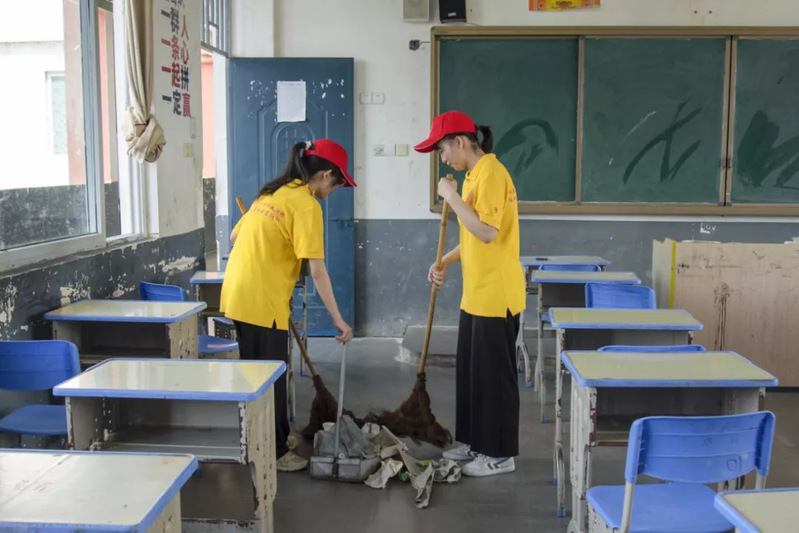 经过一晚上的修整,暖风队员们迎着清晨第一缕阳光开始了全新的一天。为了给孩子们创造整洁、愉快的学习环境,同时也落实了学校五育并举德智体美劳共同发展的目标导向,队员们自发组队对卫生间、教室进行了大扫除。