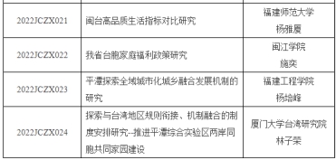 2022年5月20日2022年度福建省人民政府发展研究中心决策咨询研究重大课题立项通知发布,我院施奕博士喜获《我省台胞家庭福利政策研究》重大课题立项。依据省委、省政府办公厅印发的《关于加强福建新型智库建设的实施意见》福建省决策咨询研究重点课题视同省社科规划重大项目