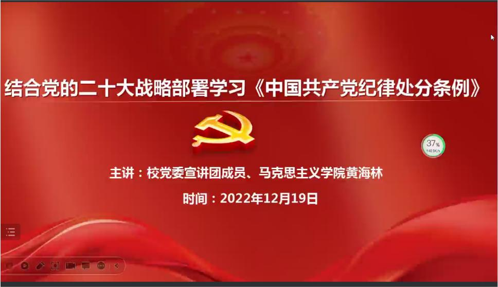 12月19日晚, 韩国成人电影 举行“学习二十大,永远跟党走”学生党员培训班系列专题讲座。韩国成人电影 党委宣讲团成员、马克思主义学院形势与政策教研室主任黄海林副教授以“结合党的二十大战略部署学习《中国共产党纪律处分条例》”为主题,深入阐释了党的二十大报告要点、重点,结合报告中关于坚定不移全面从严治党的论述,解读分析了《中国共产党纪律处分条例》的亮点、热点。 韩国成人电影 全体学生党员参加讲座。