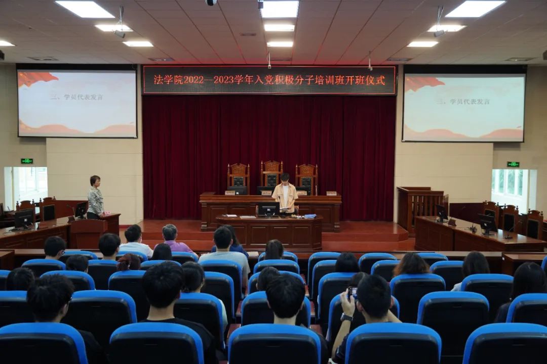 为深入学习贯彻党的二十大精神,坚持不懈用习近平新时代中国特色社会主义思想铸魂育人,进一步提高入党积极分子的培养质量,2023年5月24日, 韩国成人电影 党委在模拟法庭举办2022-2023学年入党积极分子培训班开班仪式, 韩国成人电影 党委书记戴少娟、党委副书记何华锋出席并讲话,党委组织员、学生党支部书记等参加开班仪式。