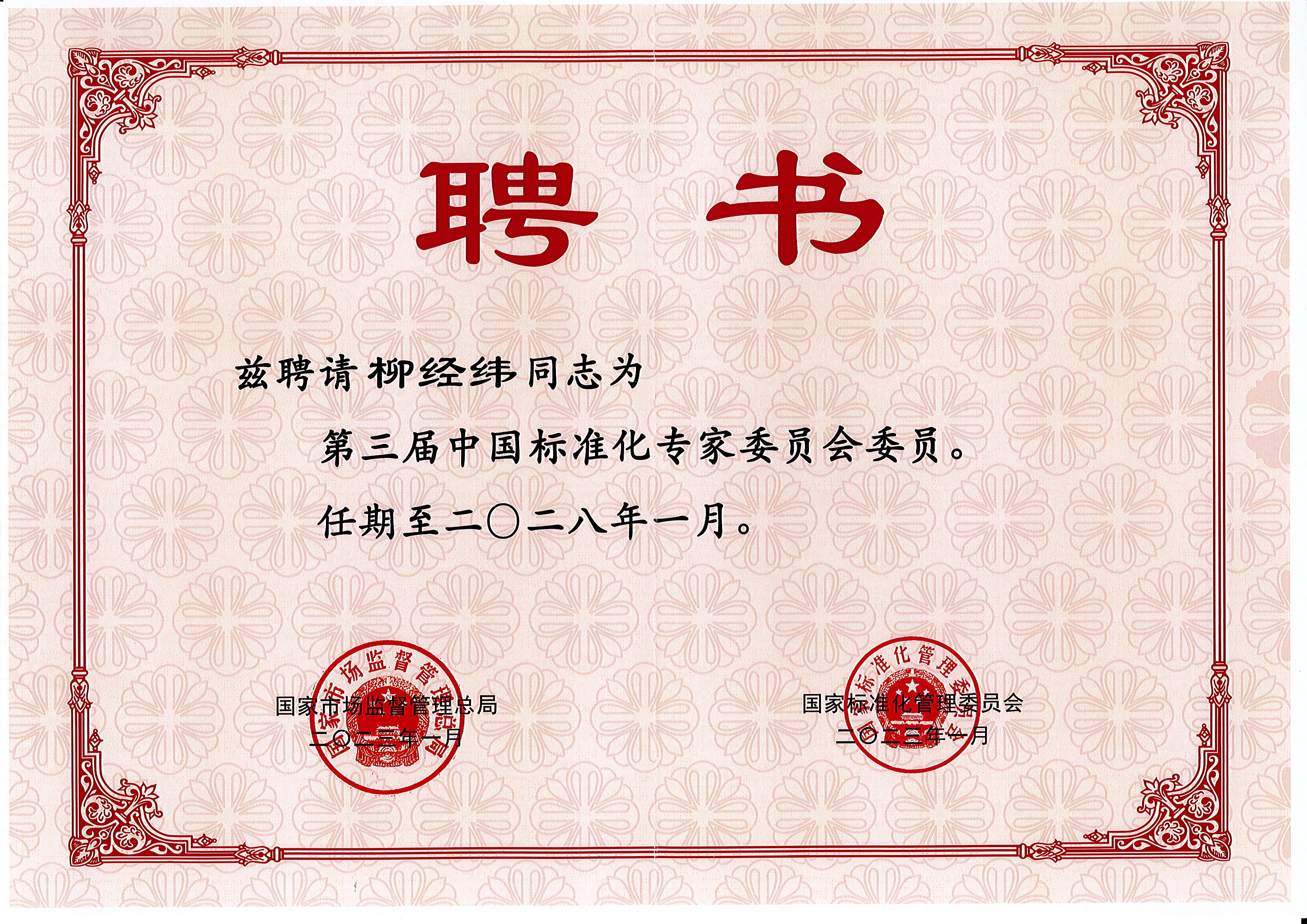 2023年1月6日,国家市场监督管理总局发布《关于第三届中国标准化专家委员会组成人员的通知》(国市监标技函【2023】1号),第三届中国标准化专家委员会换届工作完成。韩国成人电影 韩国成人电影 名誉院长柳经纬教授被续聘为第三届中国标准化专家委员会委员,任期五年。