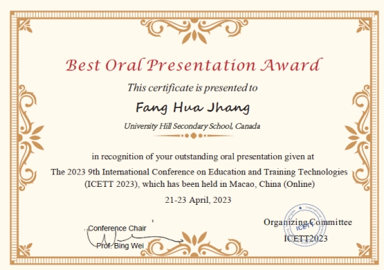 张芳华教授参与国际学术研讨会获得最佳口头报告奖