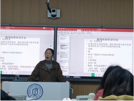系主任刘巧兴、郑净方、陈雄、许偲、陈博、吴雅婷等多名法律系教师参加集体听课评课。 课程伊始,主讲教师郑学勤老师首先引导学生回顾了前一次课程的内容,对民事法律关系的重点知识进行串讲;接着,郑老师从几个生活实例入手,引出了本节课的主题——民事权利能力。在课堂讲解环节中,郑老师从民事权利能力的概念深入分析和阐释其内涵,通过使用贴近生活的生动例子、新旧法条的对比和阐释,以及设置练习题和案例分析的方法,帮助学生深入理解自然人民事权利能力的起止、自然人出生和死亡的判断标准、胎儿利益的特殊保护等重要问题。