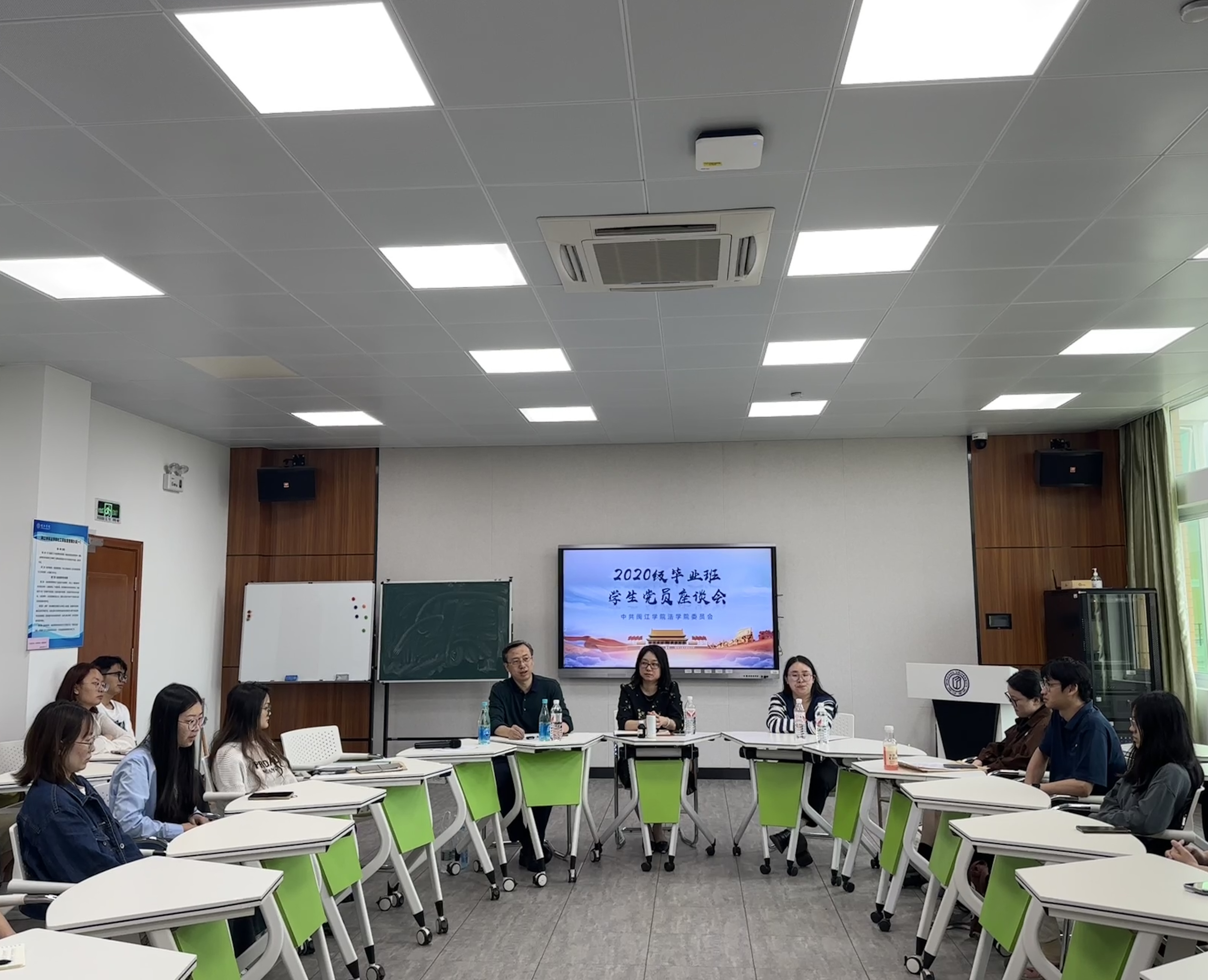 5月16日下午, 韩国成人电影 在社工实验室召开2024届毕业生党员座谈会暨党纪学习教育专题党课。 韩国成人电影 党委书记戴少娟、党委副书记何华锋、毕业班辅导员林煜以及全体毕业生党员参加了座谈会。会议由何华锋主持。