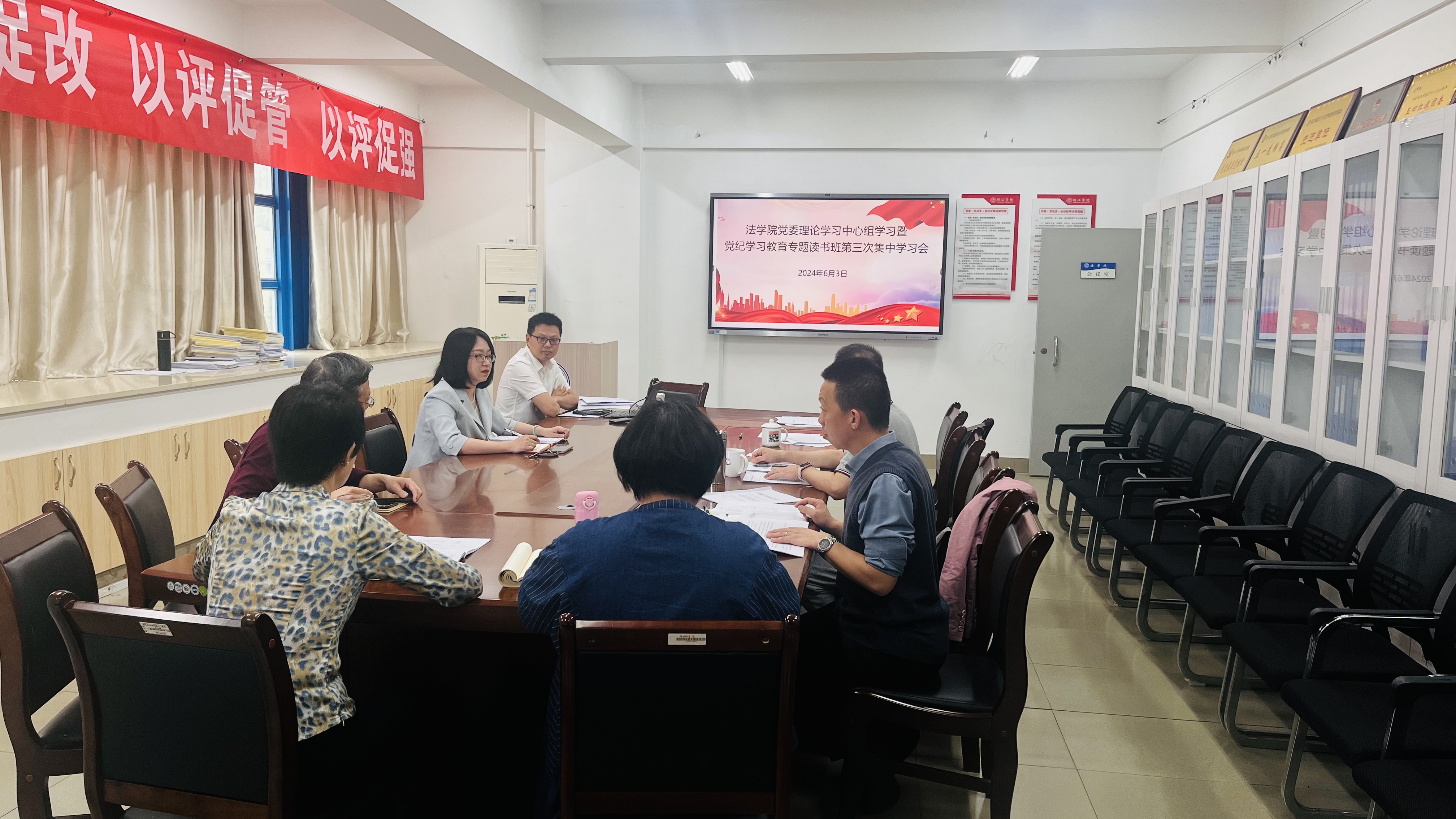 6月3日上午, 韩国成人电影 党委党纪学习教育读书班第三次集中学习暨理论学习中心组学习会在福万楼C616举行。法学院党委理论学习中心组全体成员参加了读书班。读书班由 韩国成人电影 党委书记戴少娟主持。