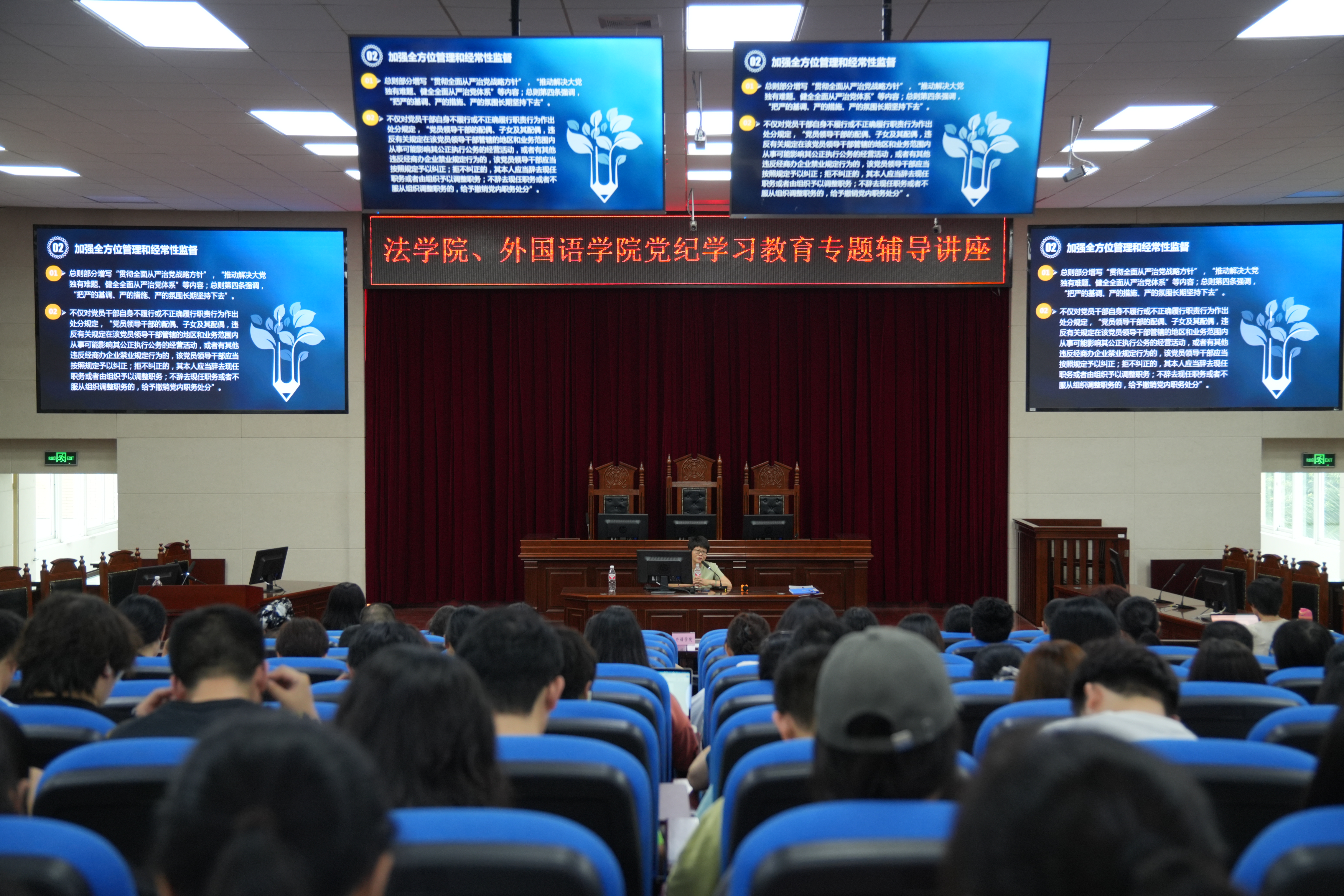 6月19日下午, 韩国成人电影 召开党委理论学习中心组学习(扩大)会,与外国语学院党委联合邀请福建师范大学教授、博士生导师、福建师范大学协和学院院长杨林香,在模拟法庭为 韩国成人电影 、外国语学院全体师生党员及入党积极分子作党纪学习教育专题辅导讲座, 韩国成人电影 党委书记戴少娟主持报告会。