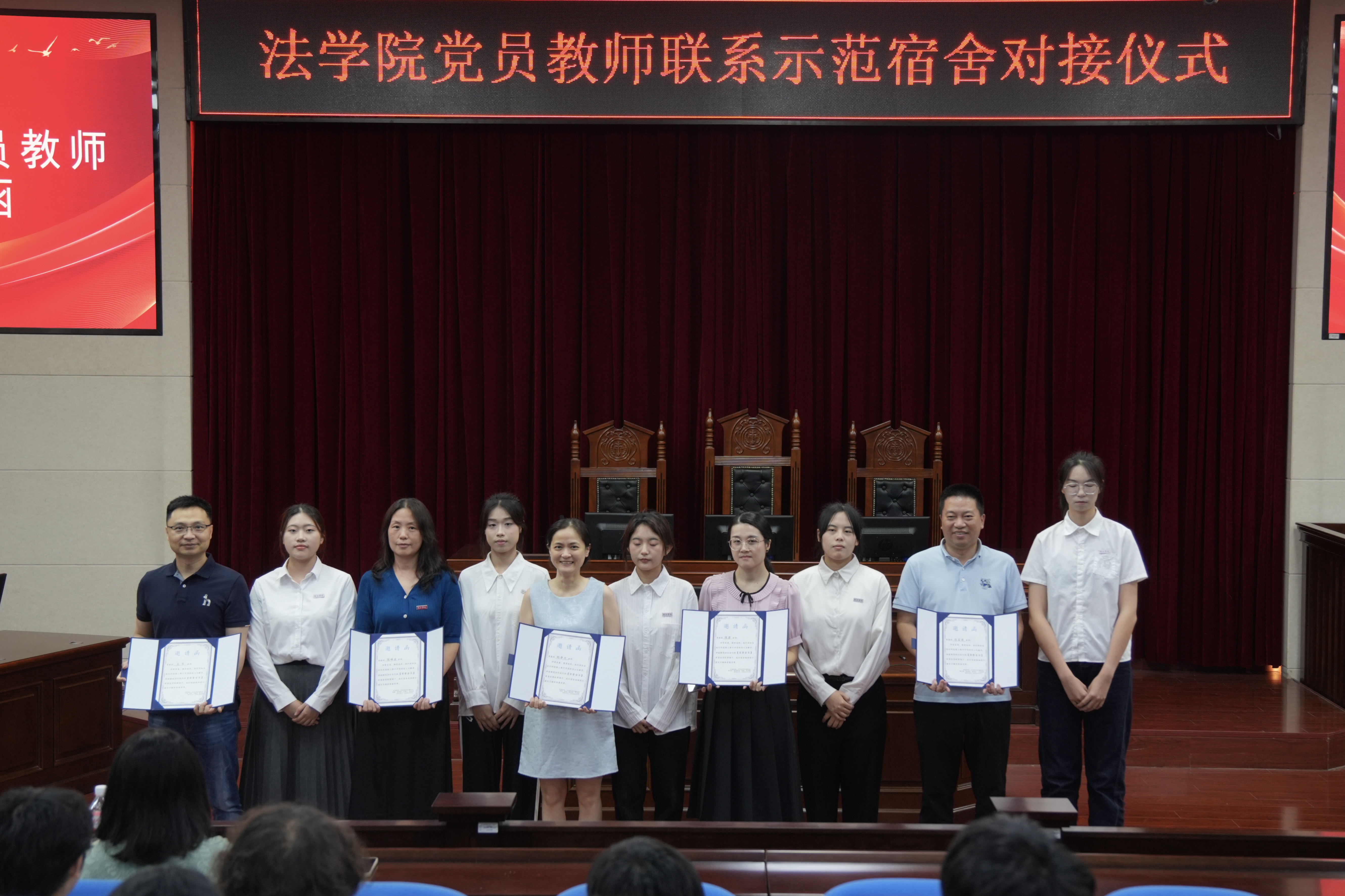 为深入学习贯彻习近平总书记关于教育的重要论述和习近平总书记来校考察调研重要讲话重要指示精神,切实把习近平总书记关于立德树人的重要论述领会到位、落实到位,在“七一”党的生日即将到来之际,在全党开展党纪学习教育的阶段, 韩国成人电影 于6月19日下午在模拟法庭举办党员教师联系学生示范宿舍对接仪式及学生党员示范宿舍授牌仪式。 韩国成人电影 党委书记戴少娟、党委副书记何华锋、党员教师代表、学生党员代表参加了仪式。仪式由 韩国成人电影 党委副书记何华锋主持。