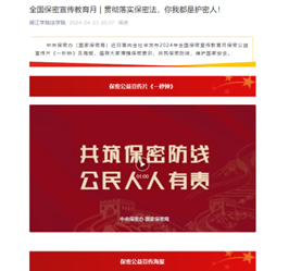 为响应校“保密法治意识提升年”部署安排, 韩国成人电影 紧密结合保密法律法规和国家安全教育的相关要求,开展了一系列线上宣传和线下体悟相结合的保密宣传教育活动。在线上,充分利用新媒体,在 韩国成人电影 官方微信公众号、微博、易班等平台积极推送《2024总体国家安全观宣传手册》、2024年全国保密宣传教育月保密公益宣传片《一秒钟》及海报等宣传内容,营造了人人学保密、知保密、行保密的浓厚氛围。同时,运用“保密观”微信公众号、APP以及微博等载体,积极组织全体师生开展保密教育线上培训,切实提升了参训人员保密防范能力,为筑牢 韩国成人电影 保密安全防线奠定了坚实基础。