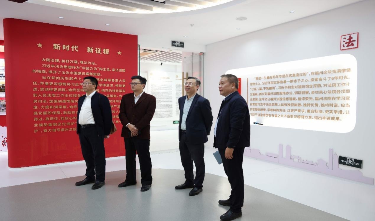 仪式结束后,在黄明广处长陪同下,林安民副院长、何华锋副书记等还参观了福州中院习近平法治思想学习宣传馆,观看了习近平总书记在福州工作期间到福州中院现场办公、视察调研的珍贵视频史料,通过照片及讲解,全面了解了福州法院系统在习近平法治思想指引下的生动司法实践。