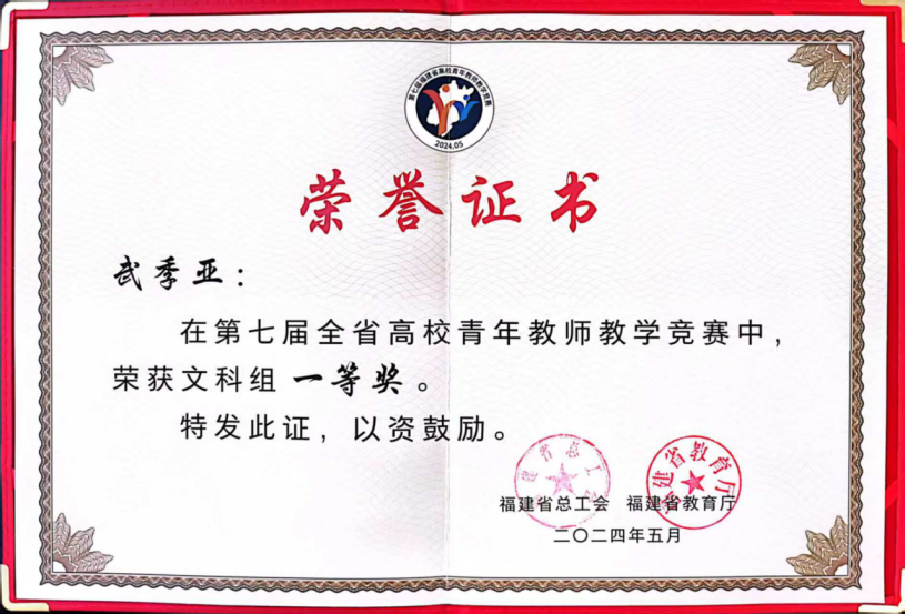 武季亚老师在任教之前,曾是一名经验丰富的社会工作师。在叠加教师角色后,她将社会工作实务中积累的人情、人性洞察融入课堂教学,学生反馈:“武老师的课堂让我们看到社会环境中的心理学呈现,让我们学会与自己和解,对他人同理。”正是得益于这样的教学改革,该课程荣获了校级示范课程的殊荣,武老师也在2024年第七届全省高校青年教师教学竞赛斩获了文科组一等奖,并荣获了福建省高校青年“教学能手”的荣誉称号。此外,她关于“加强社会心理健康服务体系建设的相关建议”的内参报告,还获得了省委领导的关注与肯定批示,直接为政府决策提供了有益的参考。