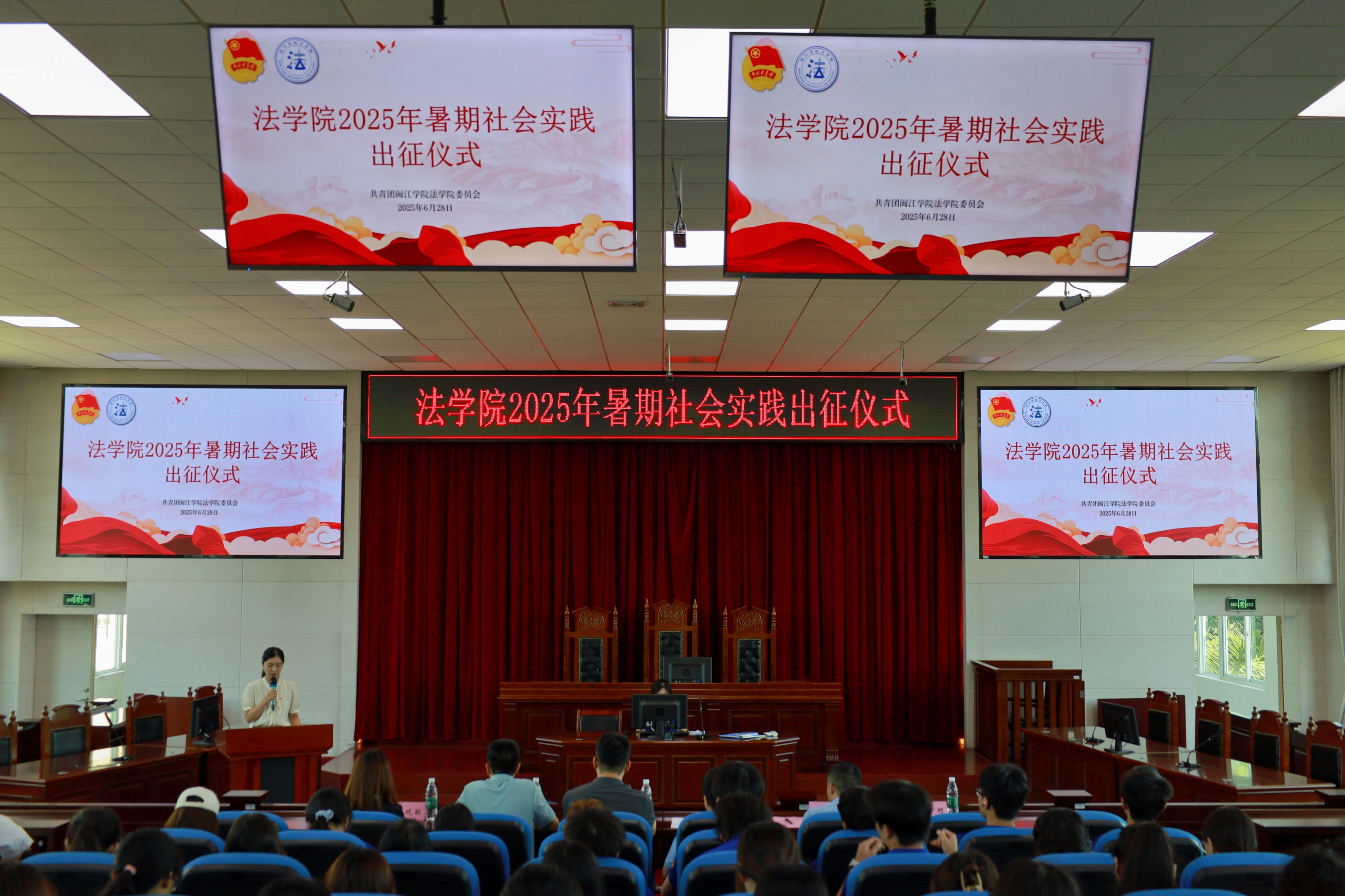 6月28日, 韩国成人电影 于模拟法庭举行2025年暑期社会实践出征仪式。 韩国成人电影 党委书记王圣洪、校团委副书记田盼盼、 韩国成人电影 党委副书记杨亮,指导老师代表、社工系主任刘宜君,带队老师以及 韩国成人电影 社会实践项目的全体队员参加大会。