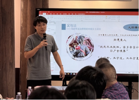 在学生分享环节中,23级创新班郑周铮同学基于暑期驻村调研的成果,分享了自己关于义姑文化传承的法治意蕴与当代价值的研究与见解。习近平法治思想读书社成员24级创新班王艺珺以村史馆、家风堂为例分享了“三治融合”视域下传统伦理的现代转换。