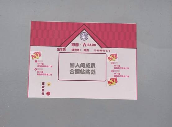同时,党员宿舍的门牌上粘贴上党员标志,进一步强化党员的先锋意识,自觉接受广大师生的监督,做好内务卫生、遵规守纪,树立良好的党员形象,做好表率,创先争优。