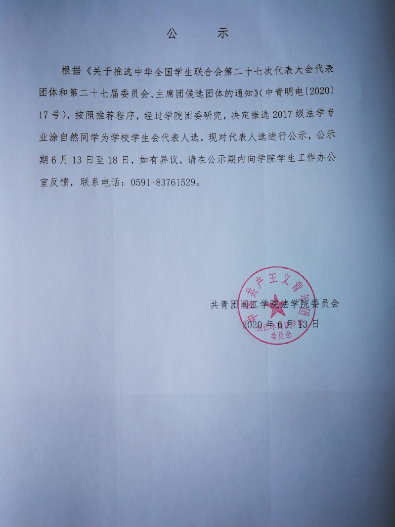 根据《关于推选中华全国学生联合会第二十七次代表大会代表团体和第二十七届委员会、主席团候选团体的通知》(中青明电〔2020〕17号),按照推荐程序,经过学院团委研究,决定推选2017级法学专业涂自然同学为学校学生会代表人选。现对代表人选进行公示,公示期6月13日至18日,如有异议,请在公示期内向学院学生工作办公室反馈,联系电话:0591-83761529。