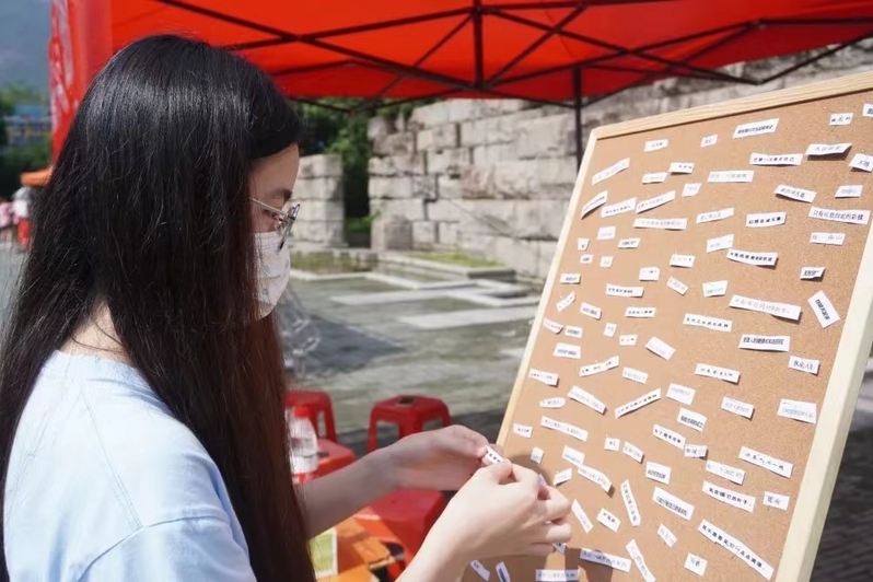 活动现场摆放主题展架,邀请师生共同参与,将法律条文、法律术语、法律谚语、常用词语和诗文选段进行截取、撕成小块之后重组顺序拼贴。活动现场,同学们尽情发挥灵感,将零散的词语和诗文选段重组拼贴,创造属于自己的浪漫诗句,赋予冰冷的法条新的生命力。在过程中师生遇到不能理解的法律术语,现场的工作人员尽心竭力为其细心解释,也起到了很好的法律知识的传播。