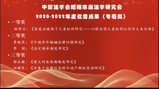 11月26日,中国法学会婚姻法学研究会2022年年会在线上召开。 韩国成人电影 郑净方老师参加了此次会议。此次会议中,郑净方老师的专著《家庭法视域下儿童权利研究——以<联合国儿童权利公约>为文本分析》受到业内专家的一致好评,获得中国法学会婚姻法学研究会2020-2022年度优秀成果(专著类)一等奖。