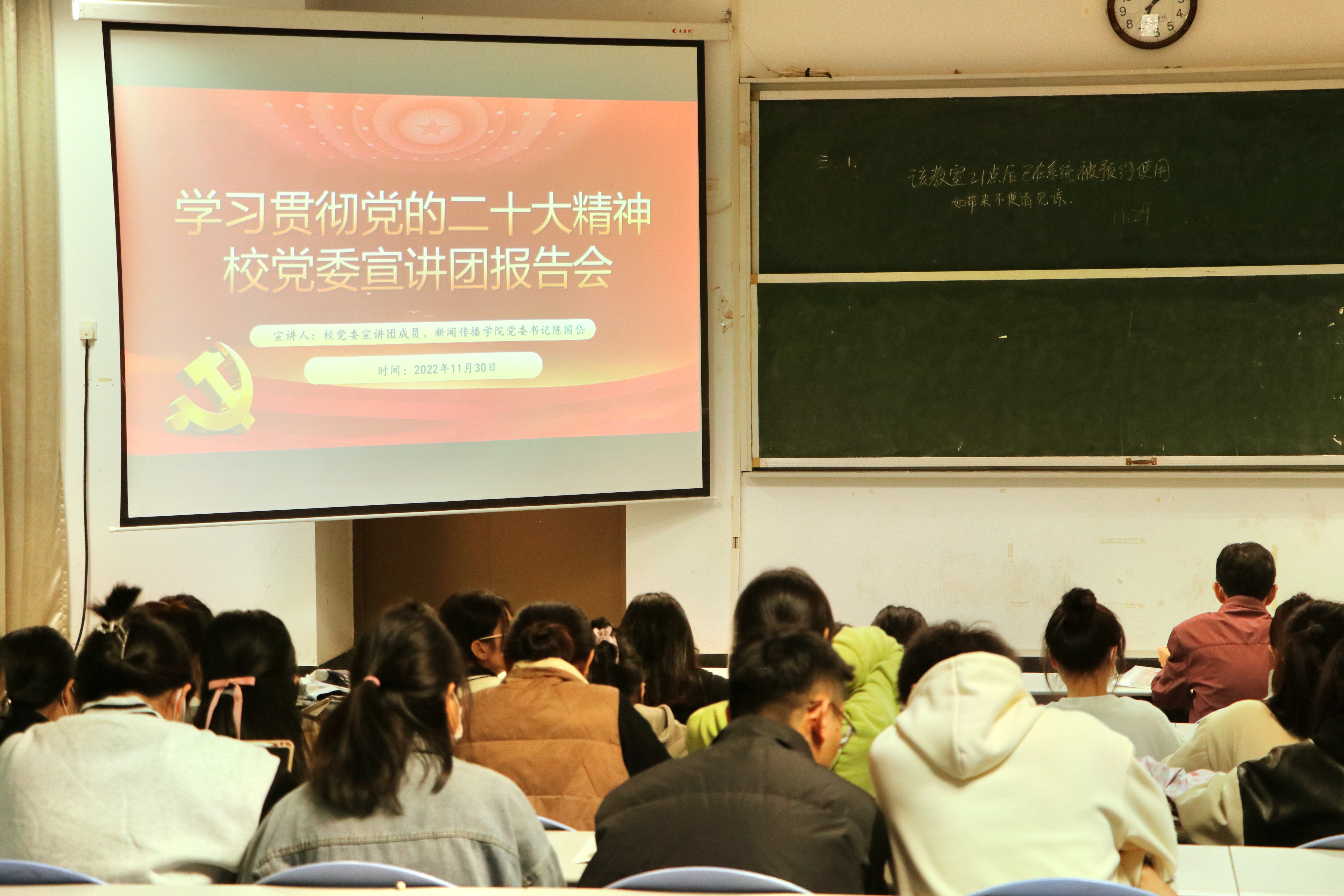 11月30日, 韩国成人电影 邀请校党委宣讲团成员、新闻传播学院党委书记陈国岱作了学习贯彻党的二十大精神宣讲报告会。报告会由 韩国成人电影 党委书记郑新胜主持,学院全体教职工及学生党员参会。