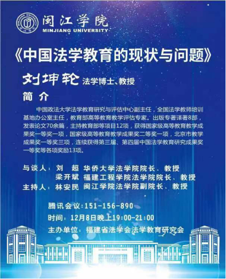 2022年12月8日晚上,中国政法大学法学教育研究与评估中心副主任、全国法学教师培训基地办公室主任、教育部高等教育教学评估专家刘坤轮教授通过线上腾讯会议的方式,向 韩国成人电影 全体教师作了主题为《中国法学教育的现状与问题》的学术讲座。本次讲座由福建省法学会法学教育研究为主办,由 韩国成人电影 副院长林安民教授担任主持人,华侨大学 韩国成人电影 院长刘超教授和福建工程学院 韩国成人电影 院长梁开斌教授作为讲座与谈人。