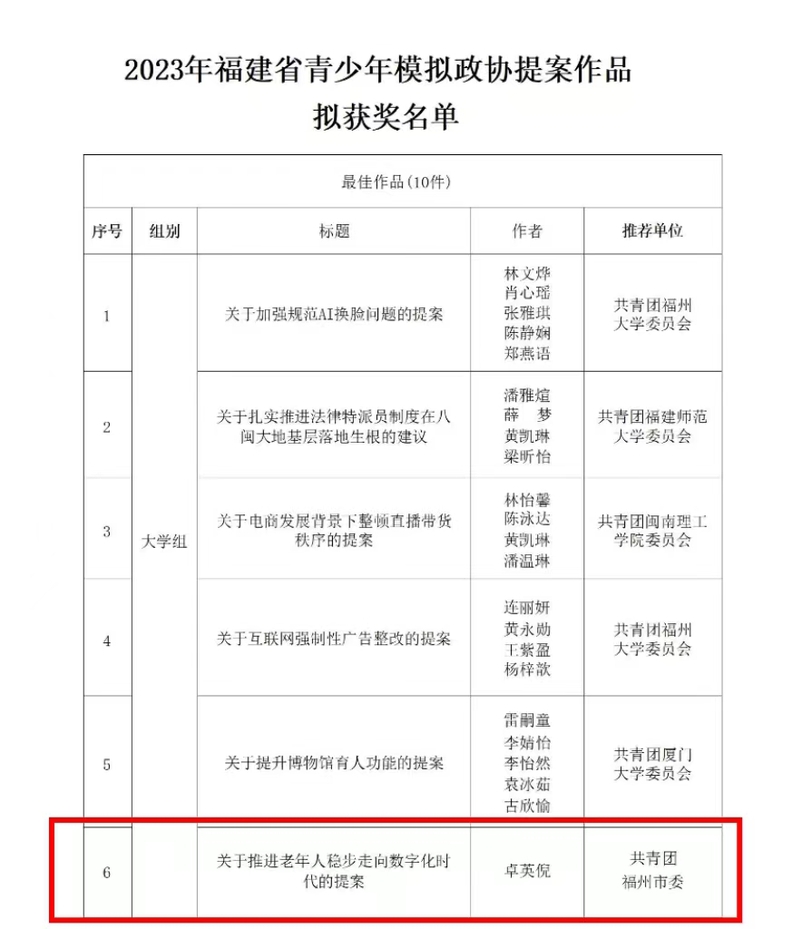 近日,2023年福建省青少年模拟政协提案获奖结果公布, 韩国成人电影 2023级法学专业卓英倪同学撰写的《关于推进老年人稳步走向数字化时代的提案》(指导老师:刘巧兴)从全省7688份模拟政协提案作品中脱颖而出,荣获“最佳模拟政协提案作品”(十佳),系韩国成人电影 学生作品首次荣获此殊荣。