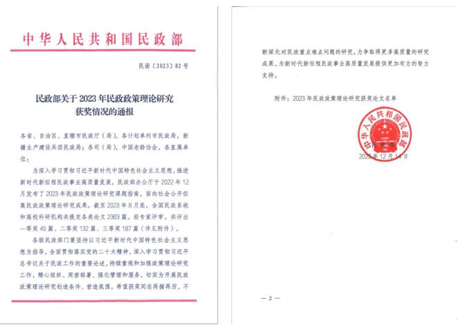 2023年12月14日,民政部发布《民政部关于2023年民政政策理论研究获奖情况的通报》, 韩国成人电影 社会工作系刘宜君老师与福州市民政局王振松、严立武、邹坚民等人合作撰写的研究报告《促进社会组织高质量发展对策研究——以福州市为例》荣获民政部2023年民政政策理论研究二等奖。截止2023年8月底,全国民政系统和高校科研机构共提交各类论文2363篇。经专家评审,共评出一等奖45篇、二等奖132篇、三等奖187篇。