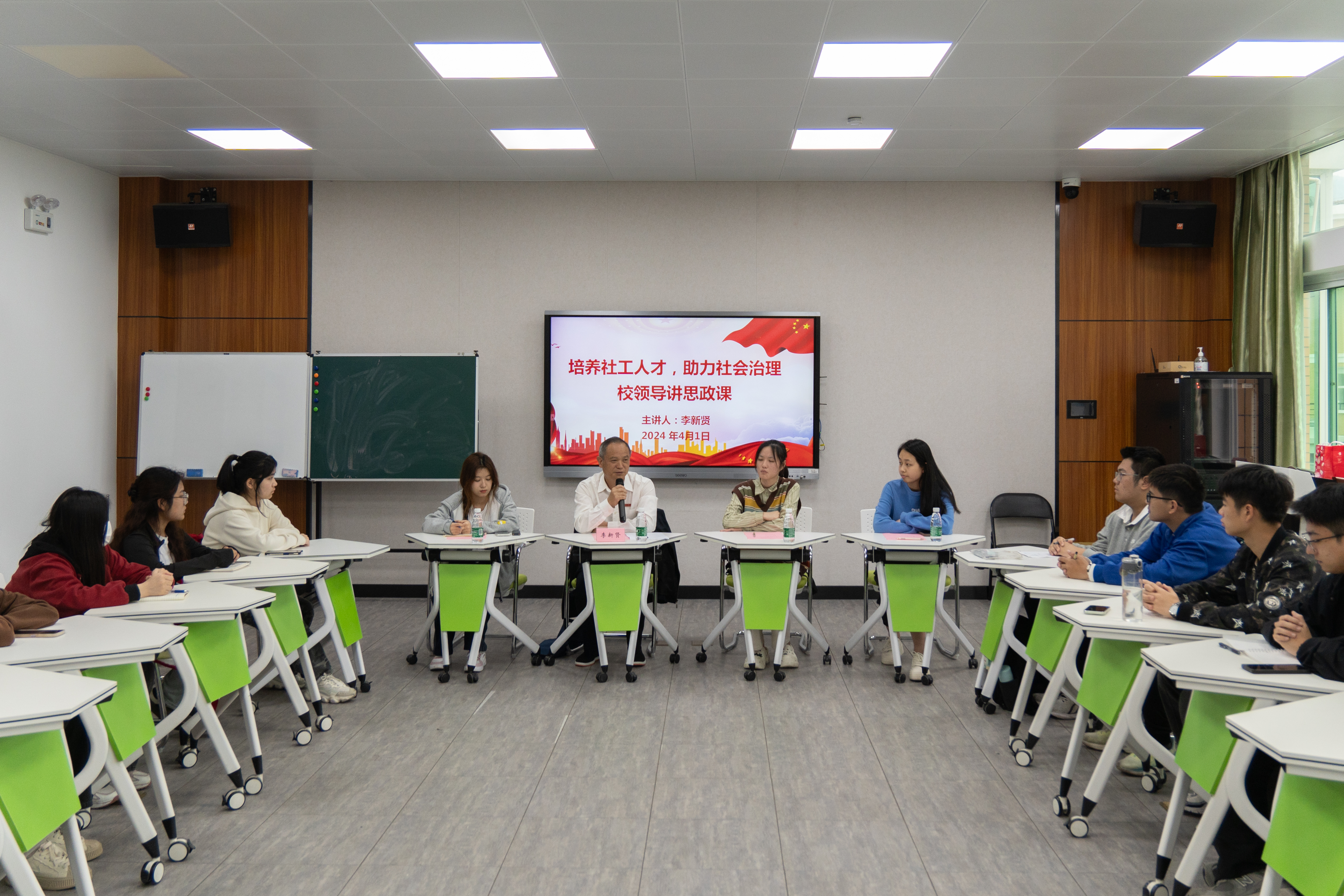 2024年4月1日,校党委常委、副校长李新贤为 韩国成人电影 2023级社会工作专业学生讲授以“汇聚社工力量,助力社会治理”为主题的思政课。参加此次思政课的还有 韩国成人电影 党委书记戴少娟、党委副书记何华锋、社会工作系主任刘宜君、2023级辅导员黄于珂。