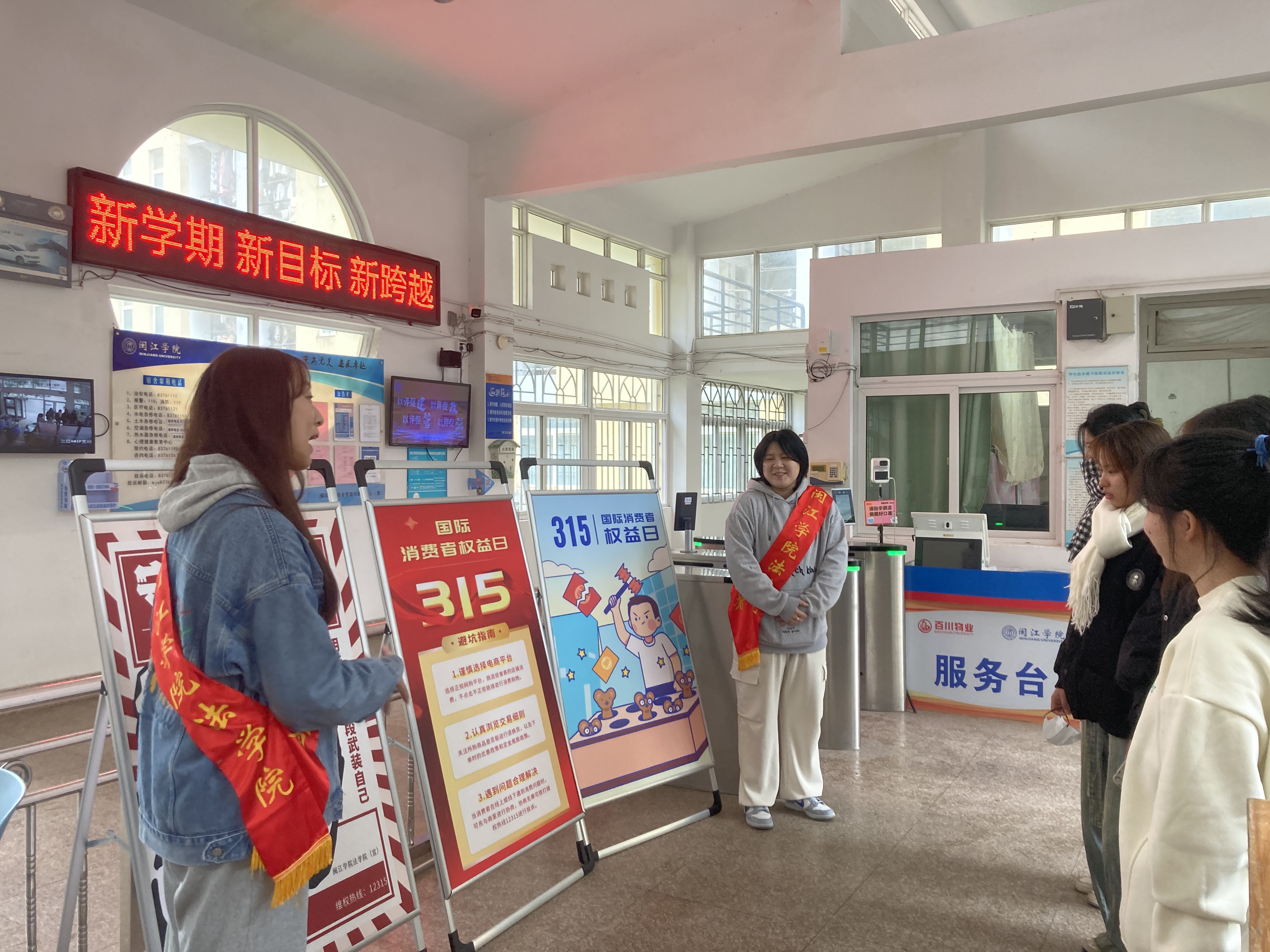 活动当天,学生宿舍园区门厅处摆放普法展板,学生志愿者进行知识普及与宣讲。宣讲内容聚焦社会消费热点话题,帮助同学们了解生活中常见的消费陷阱,学习维权的相关知识和科学办法。