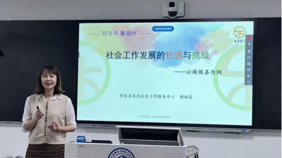 为助力社会工作专业学子明晰行业走向,把握当下机遇,直面挑战,2024年11月25日,应 韩国成人电影 邀请,福州市社会工作联合会副会长、闽侯县乐志社会工作服务中心主任傅婉霏为 韩国成人电影 社会工作专业学生开展讲座,讲座主题为“社会工作行业发展的机遇和挑战——以闽侯县为例”,讲座由 韩国成人电影 副院长苏礼和主持。