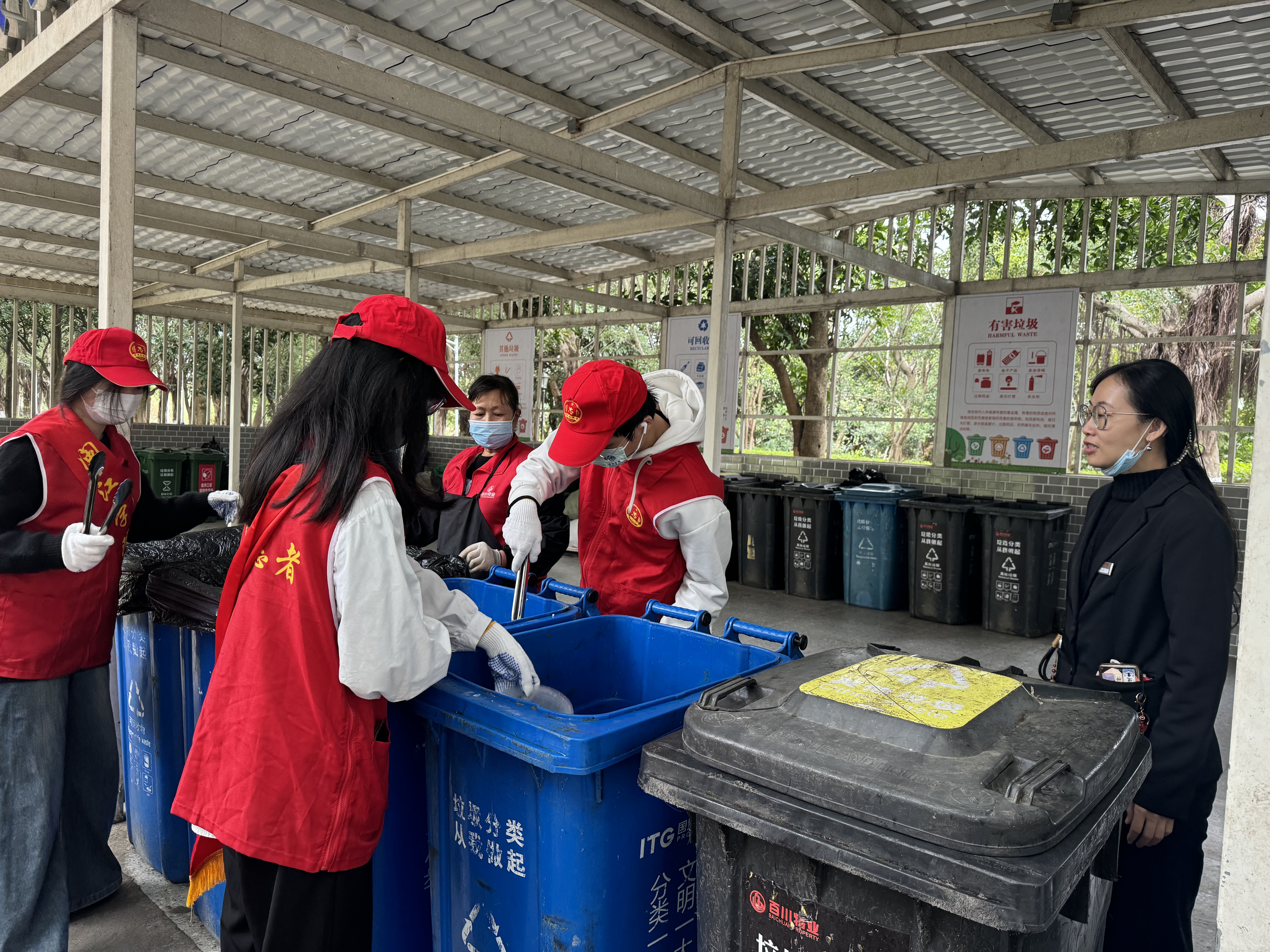 志愿者们在物业阿姨的带领下,参观了宿舍区的垃圾分类收集站与处理设施,物业阿姨为志愿者们详细介绍了垃圾分类的基本知识、方法以及每种垃圾对应的处理方式,还特别强调了正确分类对环境保护的重要意义。讲解环节结束后,志愿者们亲自体验垃圾分类的实际操作,不仅加深了对理论知识的理解,更培养了团队合作精神。