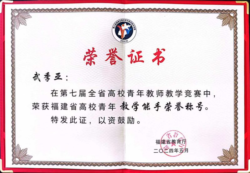 武季亚老师在任教之前,曾是一名经验丰富的社会工作师。在叠加教师角色后,她将社会工作实务中积累的人情、人性洞察融入课堂教学,学生反馈:“武老师的课堂让我们看到社会环境中的心理学呈现,让我们学会与自己和解,对他人同理。”正是得益于这样的教学改革,该课程荣获了校级示范课程的殊荣,武老师也在2024年第七届全省高校青年教师教学竞赛斩获了文科组一等奖,并荣获了福建省高校青年“教学能手”的荣誉称号。此外,她关于“加强社会心理健康服务体系建设的相关建议”的内参报告,还获得了省委领导的关注与肯定批示,直接为政府决策提供了有益的参考。