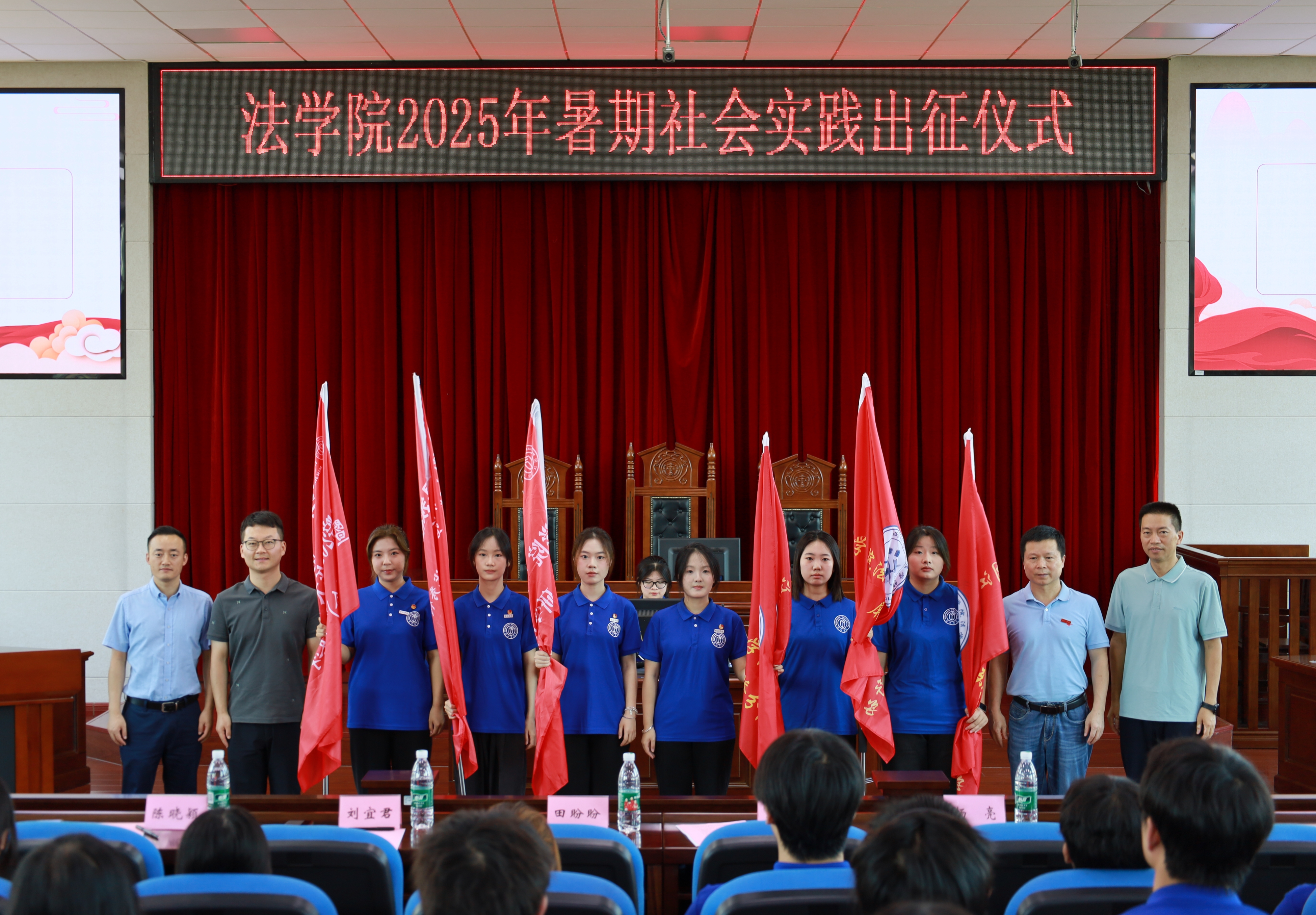 6月28日, 韩国成人电影 于模拟法庭举行2025年暑期社会实践出征仪式。 韩国成人电影 党委书记王圣洪、校团委副书记田盼盼、 韩国成人电影 党委副书记杨亮,指导老师代表、社工系主任刘宜君,带队老师以及 韩国成人电影 社会实践项目的全体队员参加大会。
